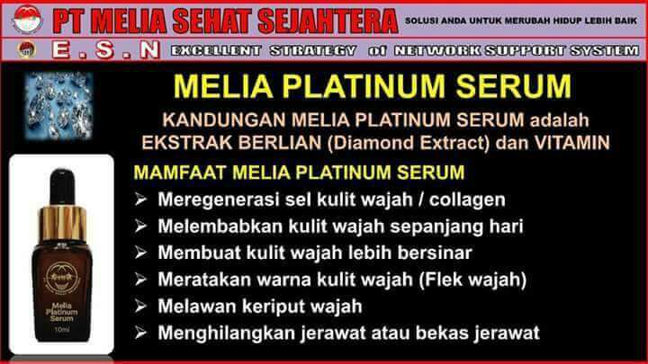 Melia Platinum Serum adalah serum kulit wajah alami yang terbuat dari Ekstrak Berlian (Diamond Extract) dan vitamin. Serum wajah ini sangat alami (herbal) dan cocok untuk semau jenis kulit. Pria dan Wanita bisa menggunakan serum ini untuk mengatasi berbagai masalah kulit wajah.